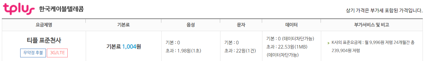 티플러스에 티플 표준천사 요금제 기본료 1004원입니다.