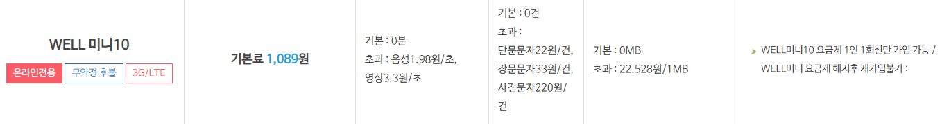 대신 위너스텔 WELL미니 요금제 (기본료 539원)가 WELL미니10 요금제 (기본료 1089원)로 변경되었습니다.