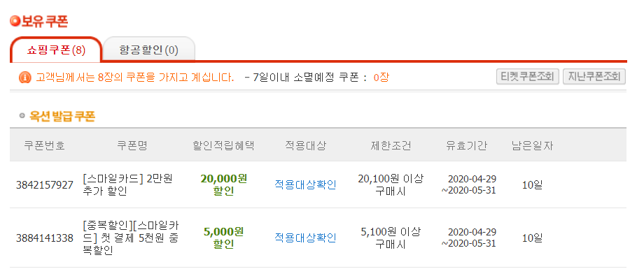 옥션에 보유 쿠폰을 확인해보니 20100원이상 구매시 20000원 할인받을수 있는 스마일카드 전용 쿠폰이 들어왔습니다.