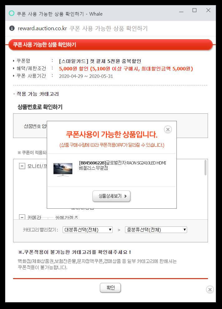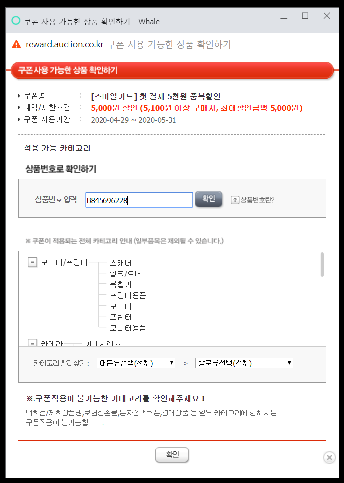 상품번호를 넣고 적용가능한 쿠폰인지 확인해봅니다.