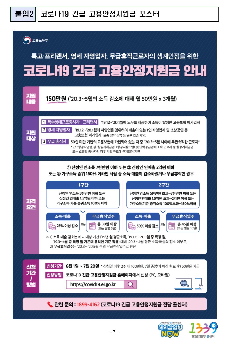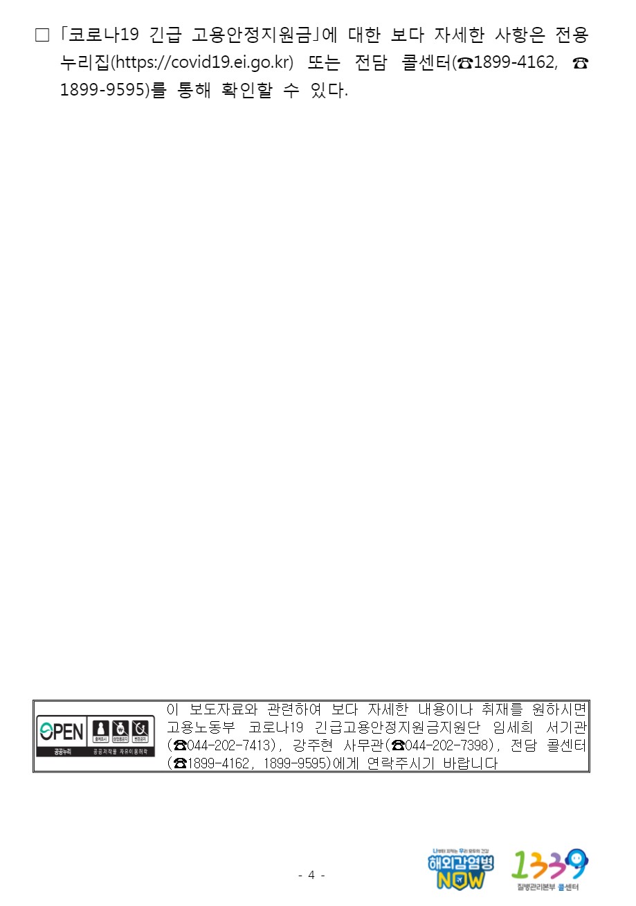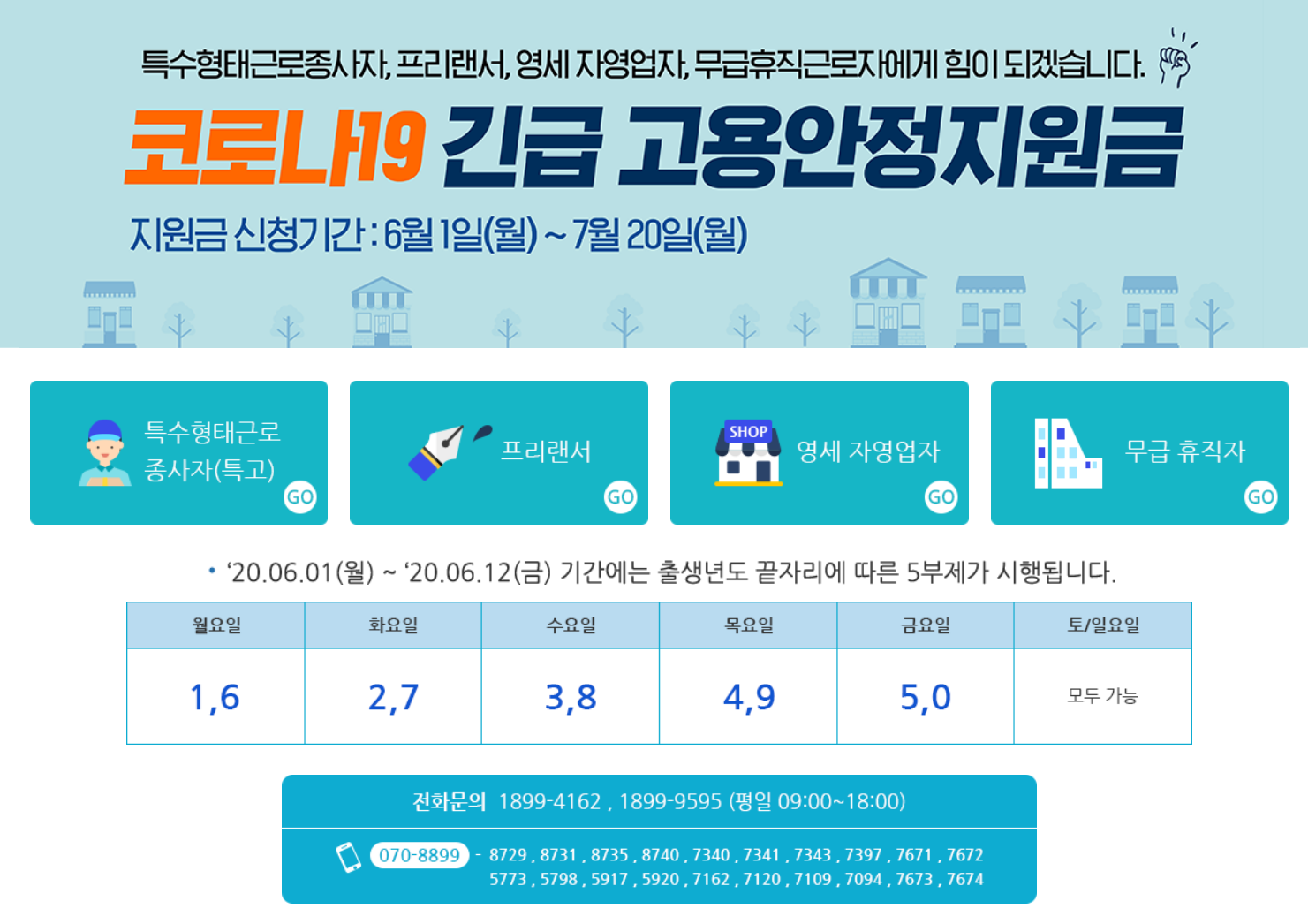 긴급 고용안정지원금 전화문의 1899-4162 , 1899-9595 (평일 9:00 ~18:00 )