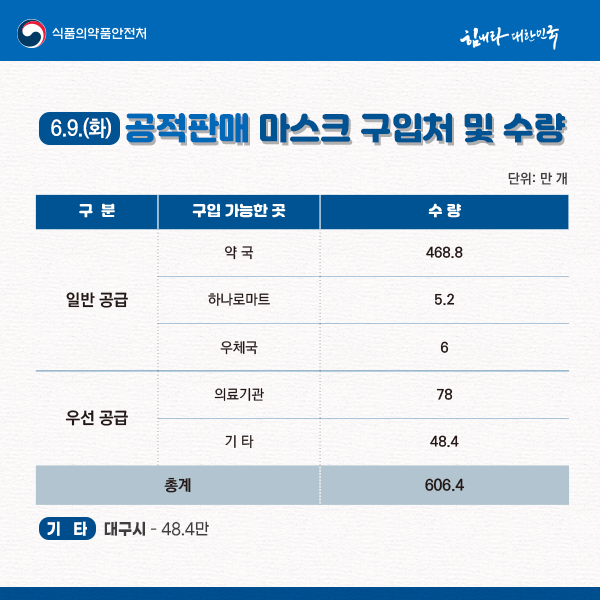 [6월 9일] 공적 마스크 총 606만 4천 개 공급!