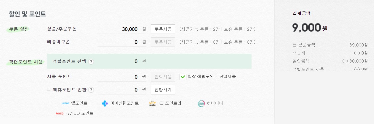 갖고 있던 적립포인트를 사용했습니다. 구매후 적립과 리뷰 (텍스트와 포토/동영상) 적립이 있습니다.