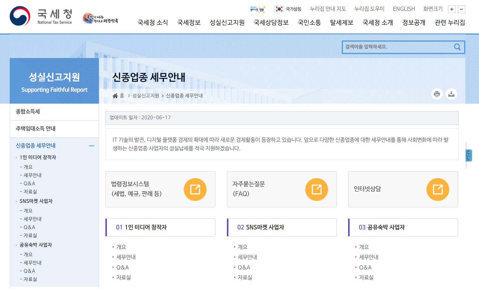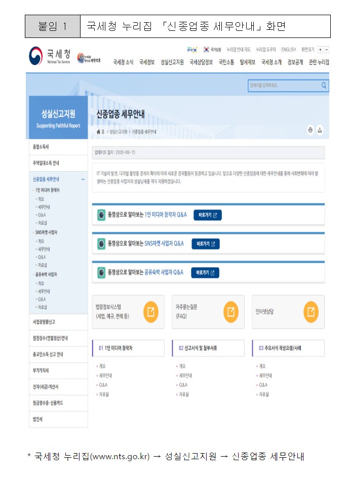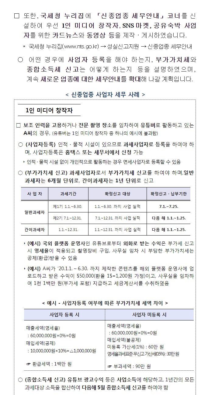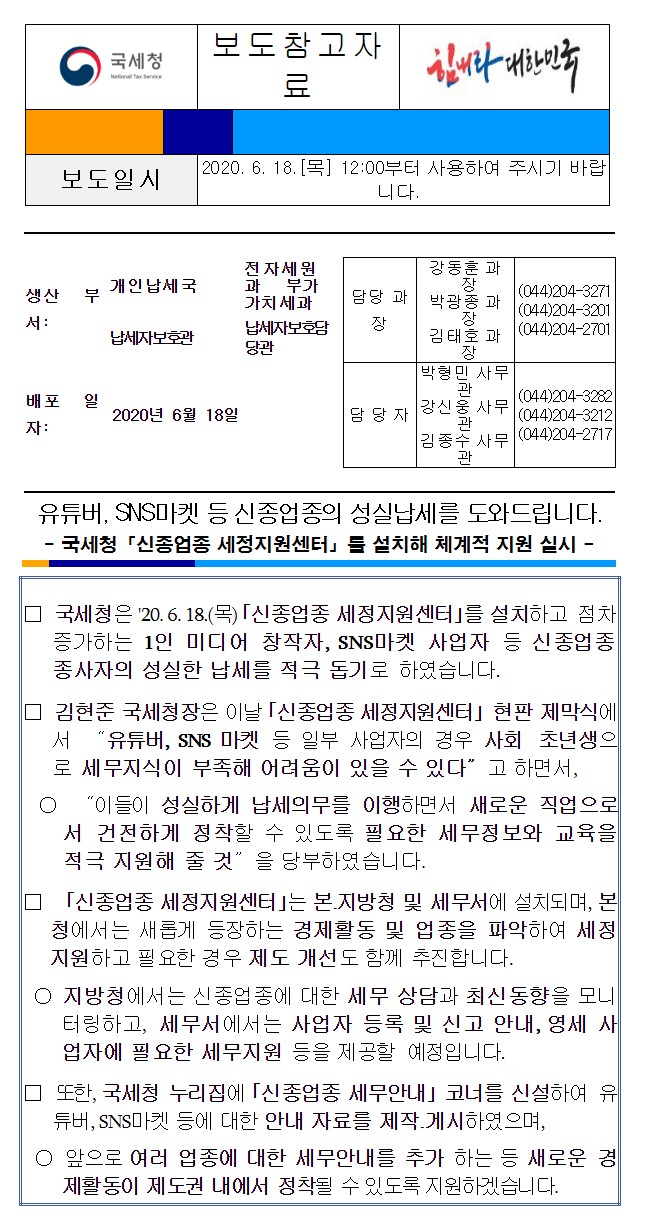 컨텐츠 유튜버, SNS마켓 등 신종업종의 성실납세를 도와드립니다. 담당부서 : 전자세원과 작성일자 : 2020-06-18 조회수 :823 유튜버, SNS마켓 등 신종업종의 성실납세를 도와드립니다. - 국세청「신종