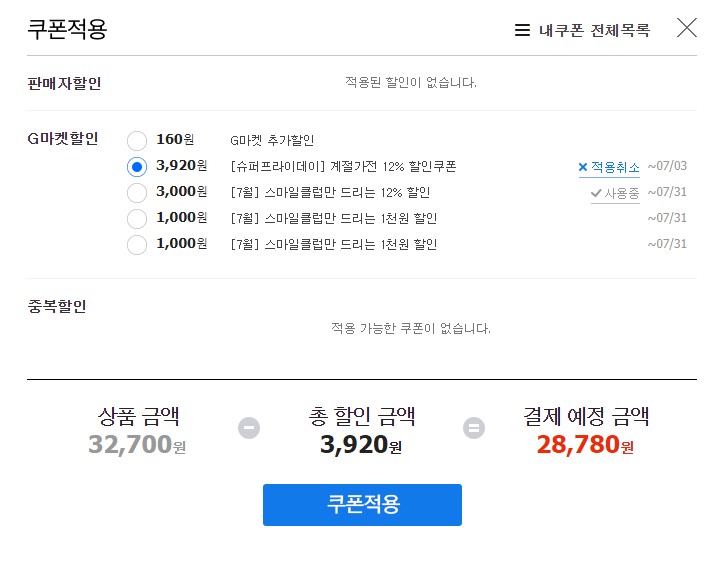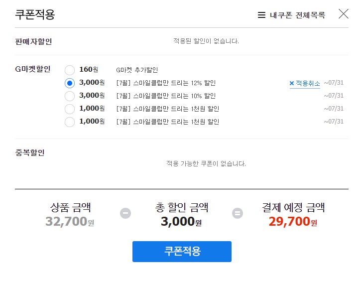 지마켓 사용하시는 분들은 스마일클럽사용하시는 분들이 많으니 스마일클럽 3000원 쿠폰까지 먹이면 29700원이 나옵니다.