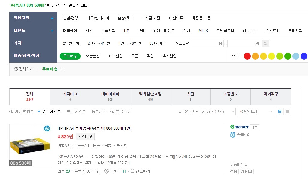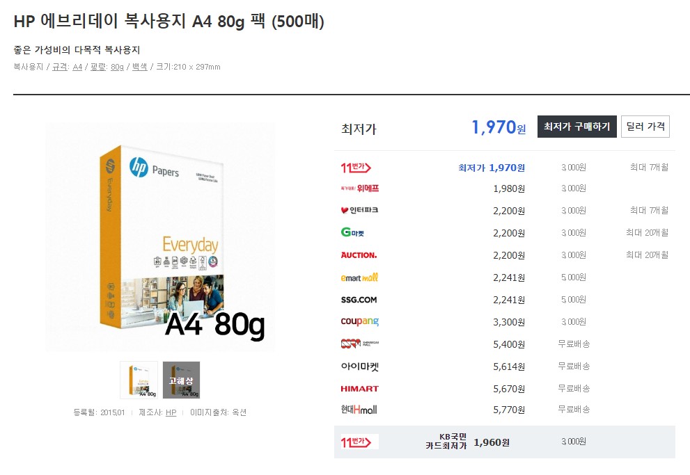 A4용지뿐 아니라 모든 제품이 오픈마켓 자체 검색해서 나온 가격, 네이버와 다나와를 경유해서 나온 가격이 다릅니다.