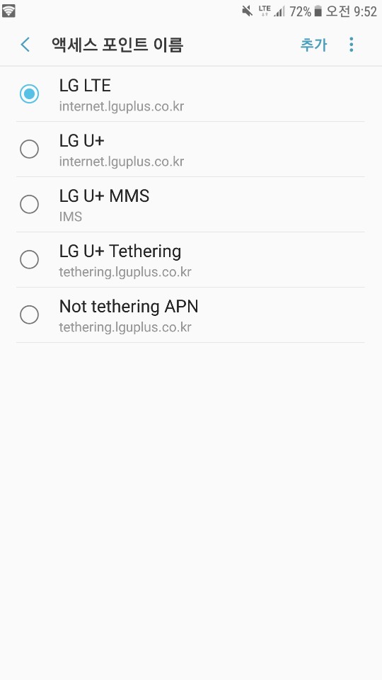 | Name: LG LTE APN: internet.lguplus.co.kr Port: (없음) 혹은 9084 MMC: 450 MNC: 06 APN유형: default,supl,dun APN프로토콜: IPV4/IPV6 |