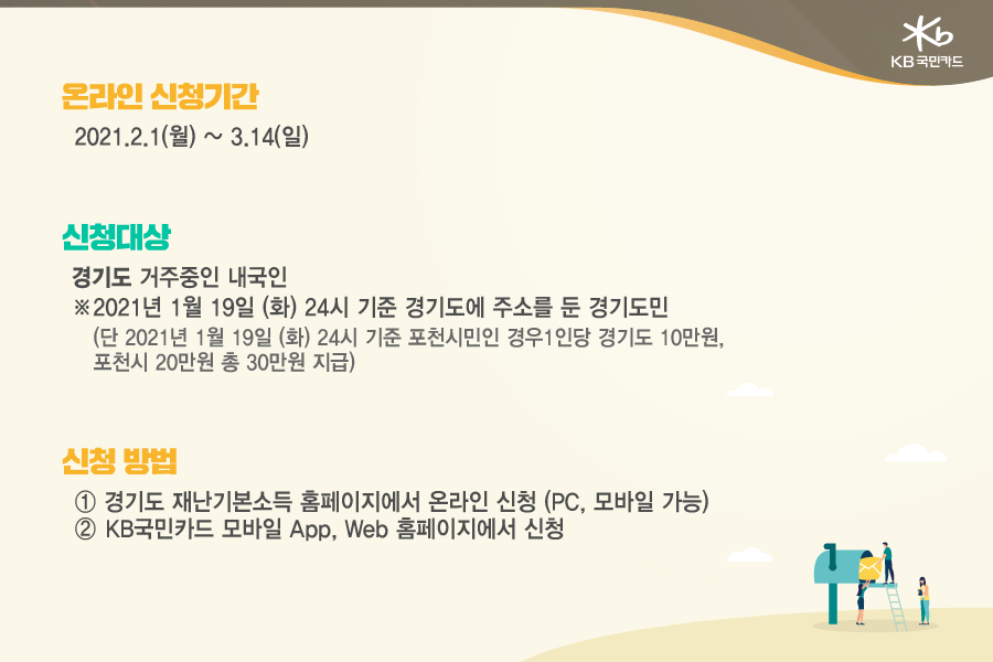 경기도 재난기본소득 지급 온라인 신청은 2021년 2월 1일(월)부터 3월 14일(일)까지 가능합니다. 경기도에 거주 중인 내국인이라면 누구나 신청이 가능한데요. 기존에 보유하고 있는 개인카드(KB국민 신용카드 및 체크카드)를 활용해 재난기본소득을 지급받는 방식이며, 경기도 재난기본소득 홈페이지 또는 KB국민카드 홈페이지에 접속해 손쉽게 신청할 수 있습니다.