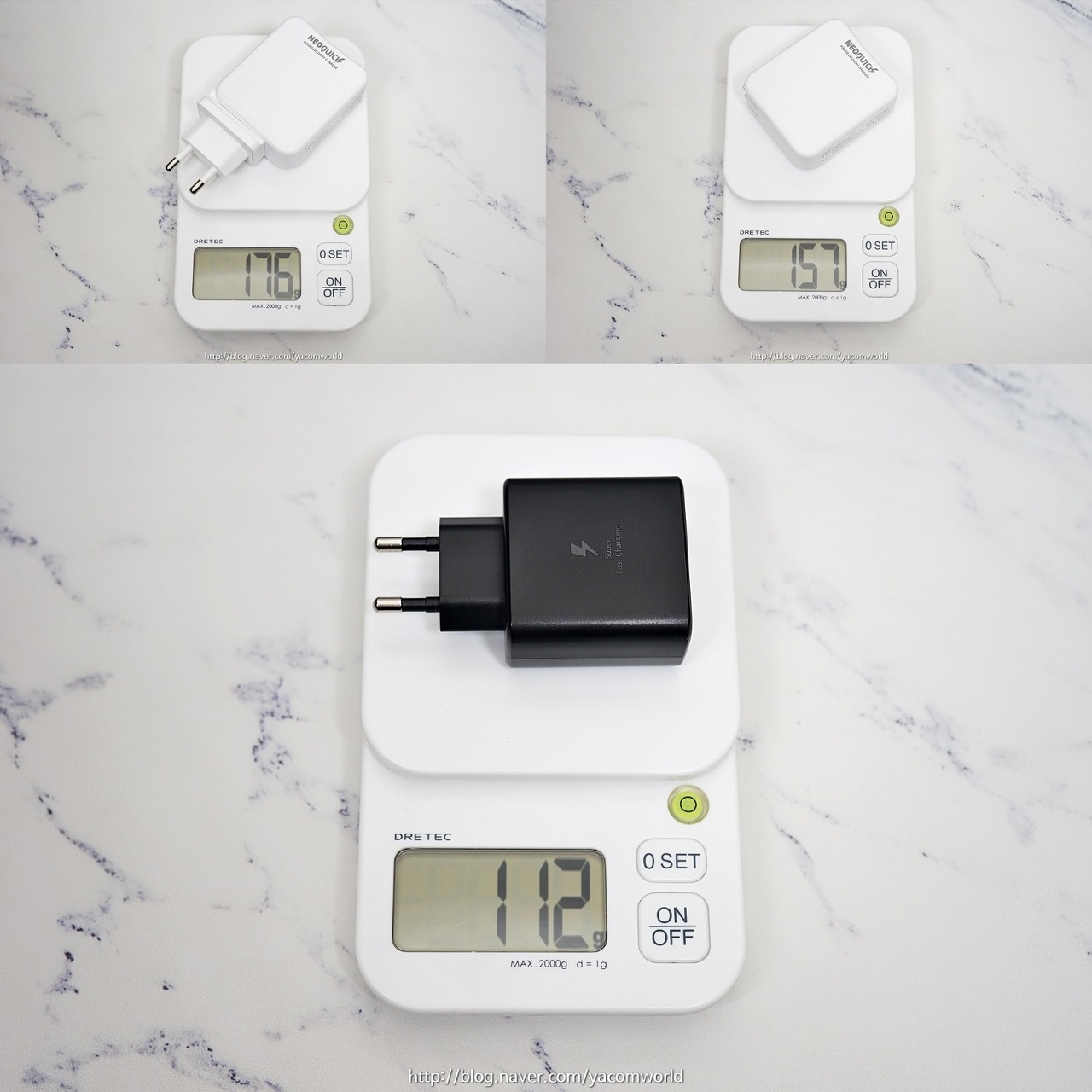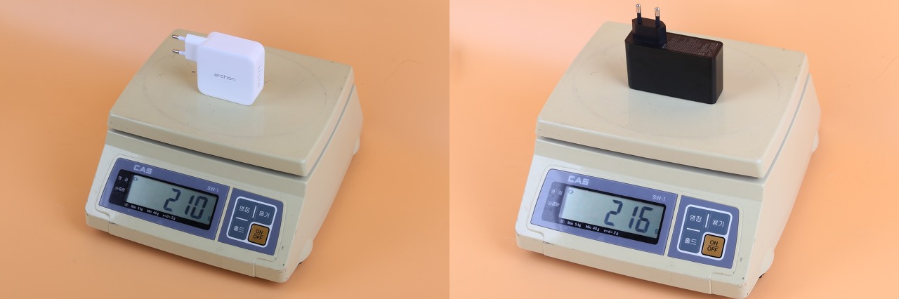무게는 아콘 ACPD100이 210g, CCGAN2P-D01는 216g이다. CCGAN2P-D01의 무게는 공식 스펙상 무게보다 4g 가볍다. 두 제품 모두 플래그쉽 스마트폰급의 무게다.