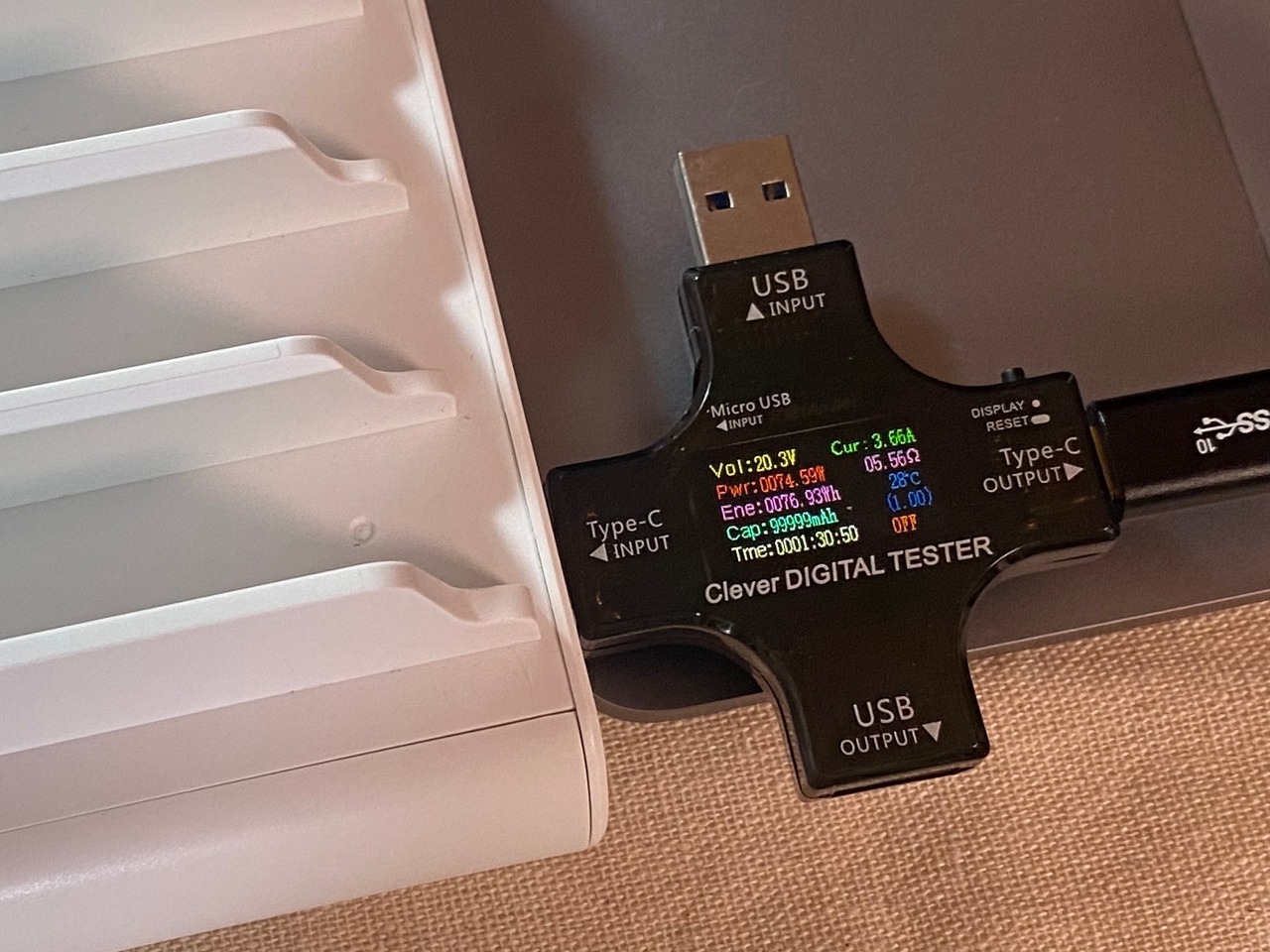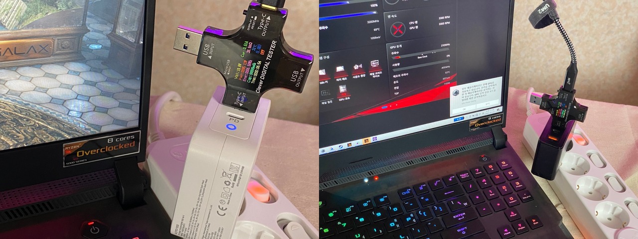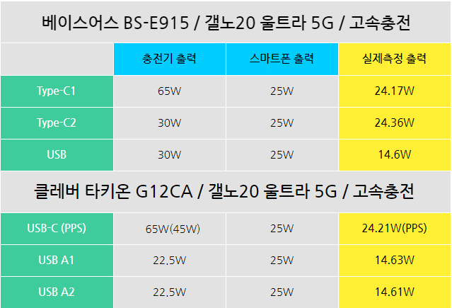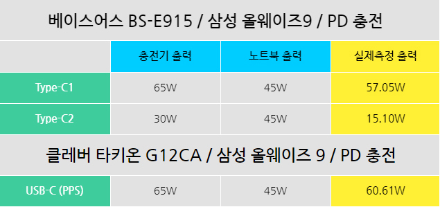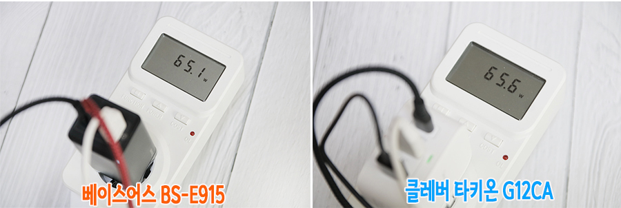 베이스어스 BS-E915 충전기는 65.1W로 최대 출력이 정상적으로 측정됐다. 클레버 타키온 G12CA 충전기는 65.6W로 75W의 충출력보다 10W가 낮게 나왔다. 45W의 삼성 올웨이즈9 노트북은 45W 그대로 출력되었지만 USB 포트 2개는 10W+10W로 20W에 고정되는 것을 확인했다.