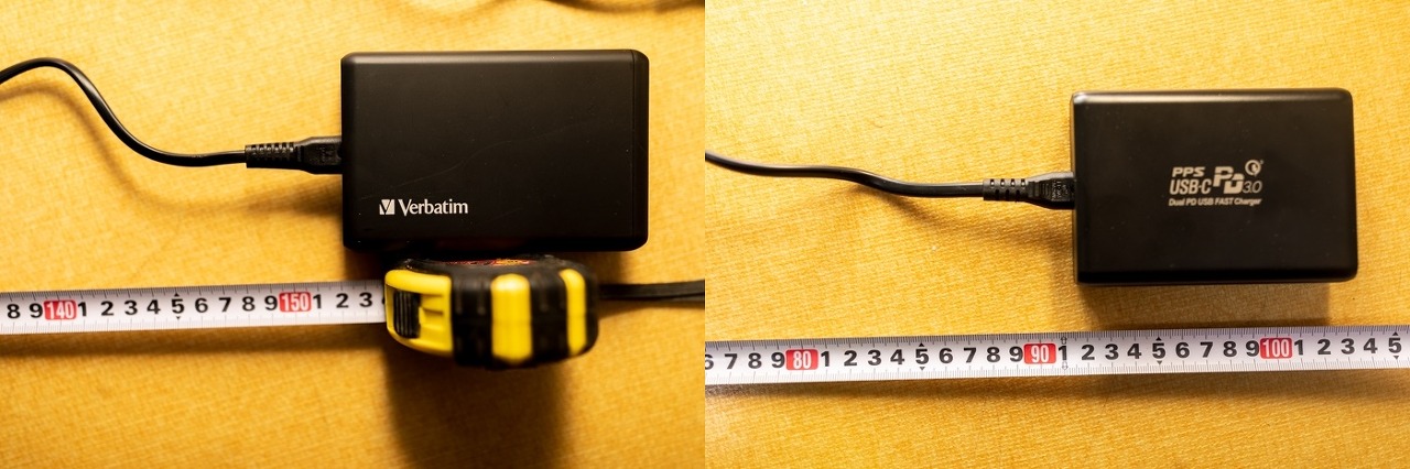 전원 케이블은 두 제품 모두 2구 AC코드를 사용한다. 실측 길이는 버바팀 USB-PD/QC3.0 55W가 약 103cm, LVSUN QCPD130W는 약 148cm다. 두 케이블 모두 접지는 지원하지 않는다.