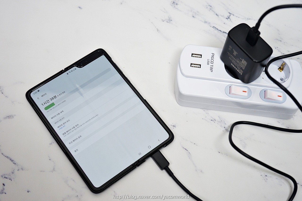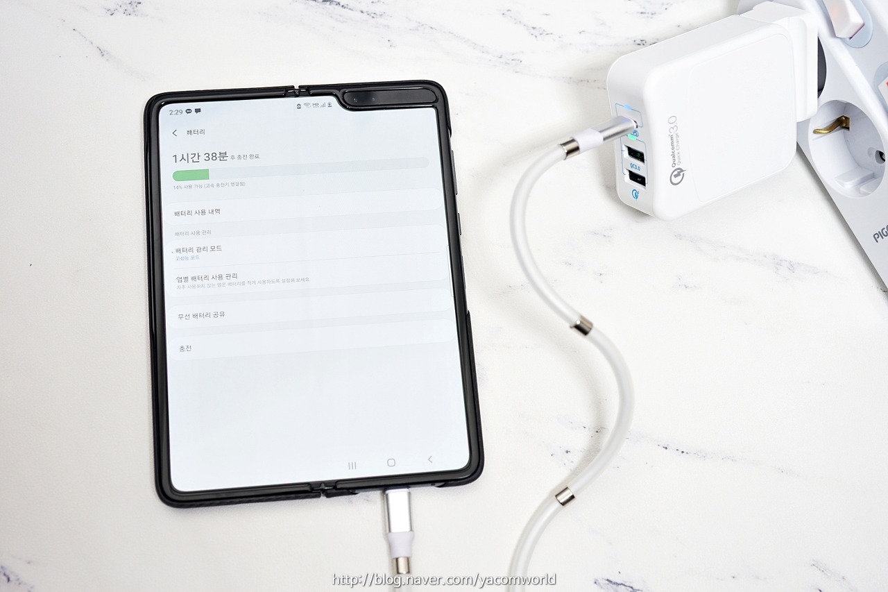 스마트폰 충전 테스트는 갤럭시 Z 폴드1(15W)가 사용됐다. 삼성전자, 아트뮤 두 제품 모두 PD충전시에 14% 상태에서 완충까지 남은 시간이 1시간 38분으로 표시됐다. 반면 PC의 USB 포트로 충전할 때는 2시간 3분으로 표시가 되었고 고속충전 표시가 사라졌다.