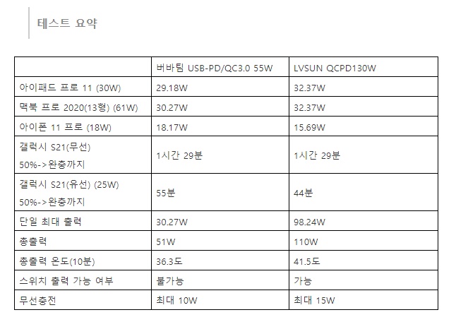 무선충전 테스트에서는 5W 무선충전기와의 비교가 진행됐다. 스마트폰의 전력이 50%인 상태에서 테스트가 진행됐다. 5W 무선충전기는 2시간 18분, 버바팀 USB-PD/QC3.0 55W는 1시간 29분, LVSUN QCPD130W도 1시간 29분을 기록했다.