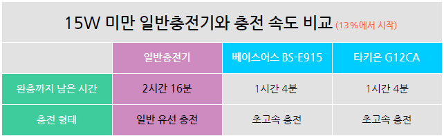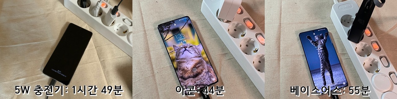 갤럭시 S21을 활용한 충전 테스트도 진행됐다. 배터리가 50% 남은 시점에서 남은 시간이 얼마로 뜨는지를 확인했다. 5W 충전기는 1시간 49분, 아콘 ACPD100는 44분, 베이스어스 CCGAN2P-D01은 55분을 기록했다.