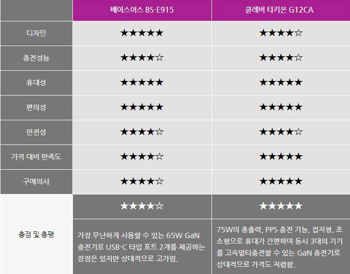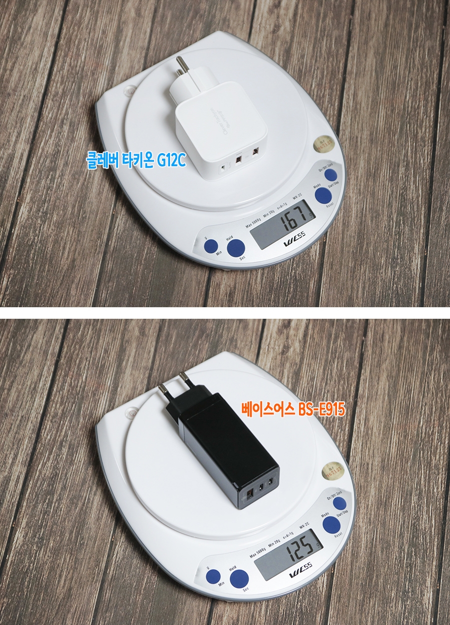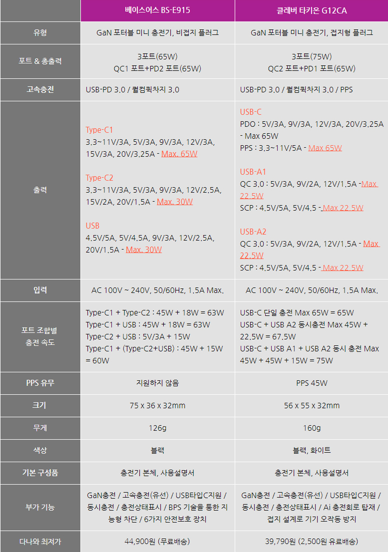 BS-E915와 G12CA는 3개의 USB 충전 포트를 지녔으나 그 구성이 다르다. BS-E915에는 USB Type-C 2개, USB Type-A 1개가 탑재됐고 G12CA에는 USB Type-C 1개, USB Type-A 2개가 존재한다. 따라서 자신이 소유하고 있는 케이블에 따라 충전기를 선택해도 좋을 것이다. 참고로 총출력은 G12C가 BS-E915보다 10W 높은 75W다.