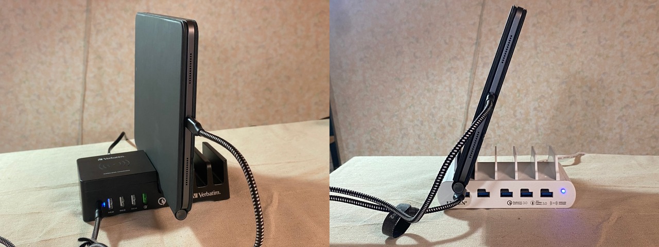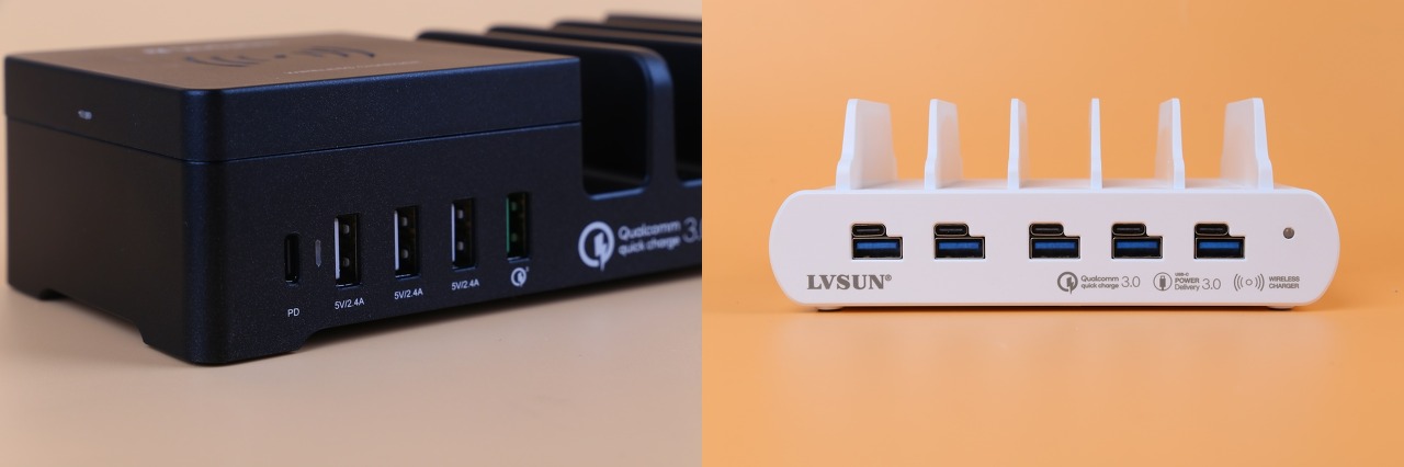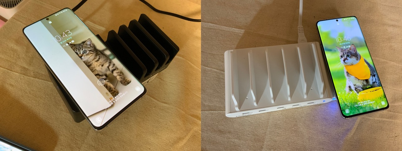 두 제품 모두 스마트 기기를 거치할 수 있는 스탠드가 내장됐다. 버바팀 USB-PD/QC3.0 55W는 총 4대의 기기를 거치할 수 있고 왼쪽의 스탠드는 공간이 더 넓어 태블릿PC처럼 두꺼운 기기도 거치하는 것이 가능하다. LVSUN QCPD130W의 스탠드보다 거치대 사이의 간격이 넓어 기기를 안정적으로 거치하기 어렵다.
