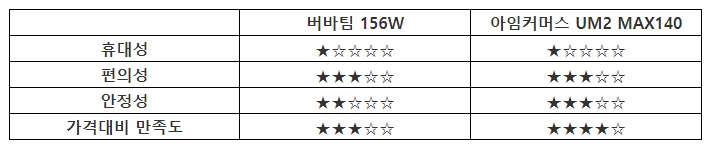 편의성은 버바팀 USB-PD/QC3.0 55W가 우세헸다. 그 이유로는 "자석 방식으로 무선충전패드를 쉽게 탈착할 수 있으며, 마이크로 5핀 케이블로 무선충전패드에 전력을 공급하는 것도 가능하다."고 밝혔다.