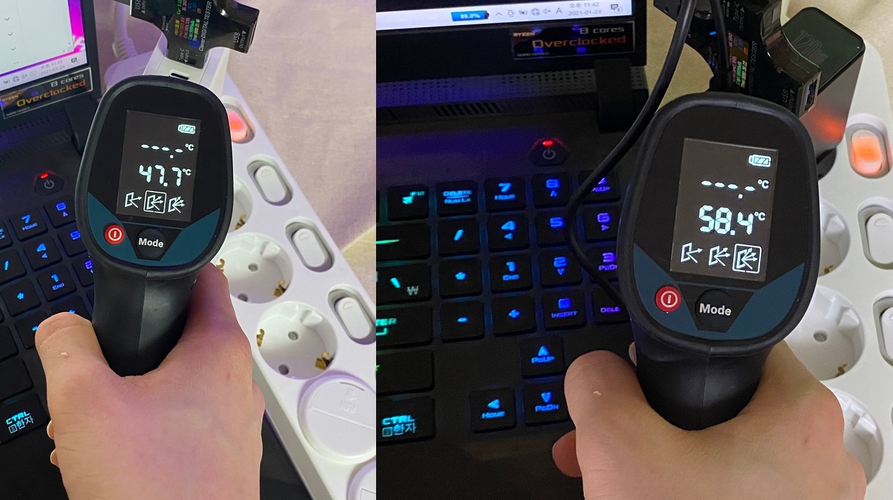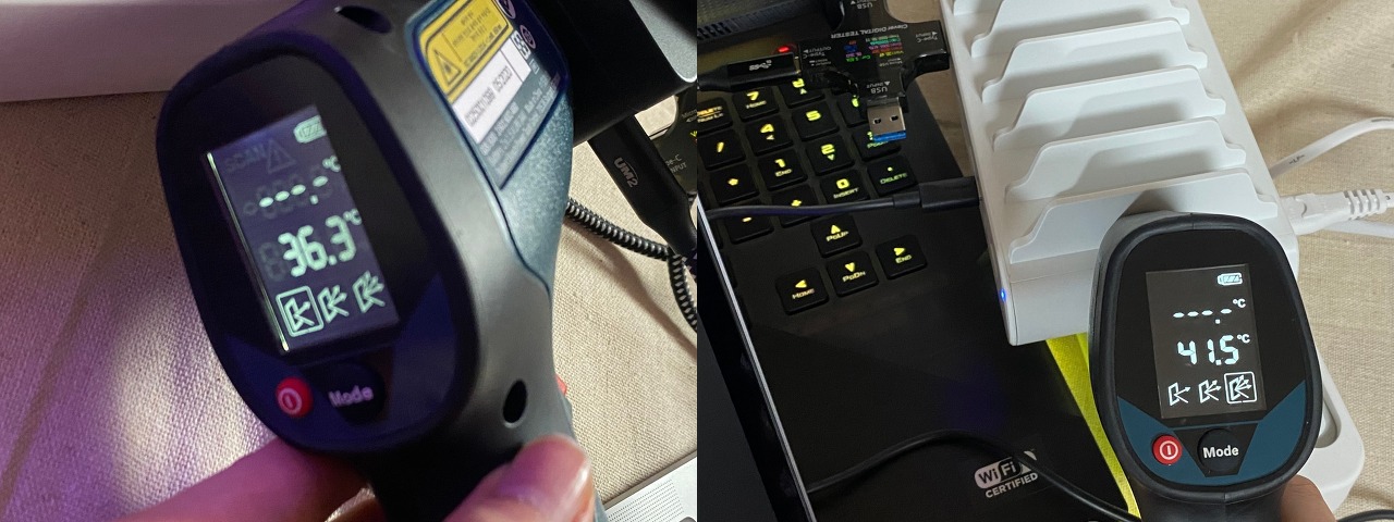 LVSUN QCPD130W로도 동일한 테스트를 진행했다. 게이밍 노트북과 맥북 프로 2020 (13형)을 같이 연결해보니, 게이밍 노트북은 50W, 맥북 프로는 60W 출력이 가능한 것으로 확인됐다. 온도는 41.5도를 기록했다. 버바팀 USB-PD/QC3.0 55W보다 뜨거웠으나 발열이 심하다고 보긴 어렵다.