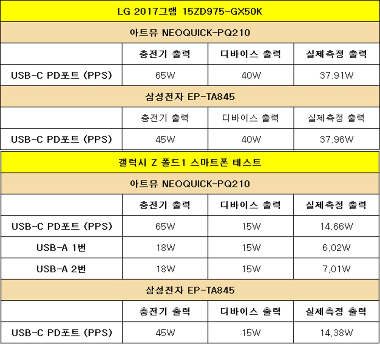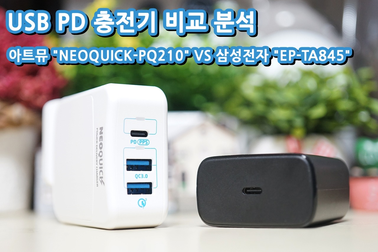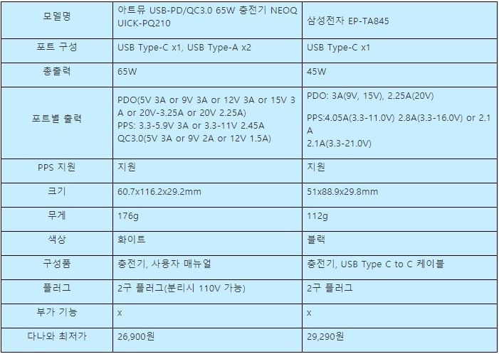 다나와 USB PD 충전기 카테고리의 인기 순위 1,2위인 '삼성전자 EP-TA845'와 '아트뮤 NEOQUICK-PQ210'이다. 가격대와 PPS 지원 등의 스펙이 유사하지만 충전기의 총 출력부터가 다른다. 아트뮤 제품이 20W 높다.