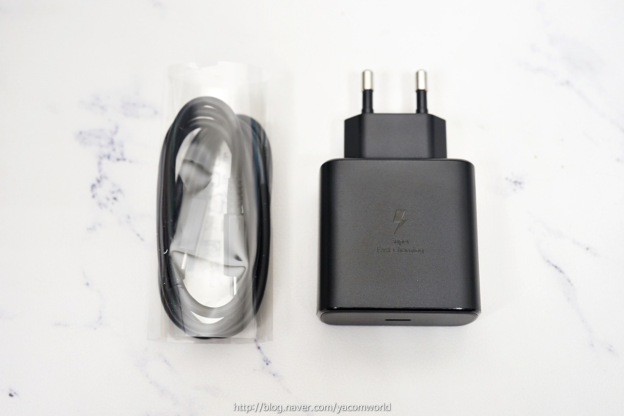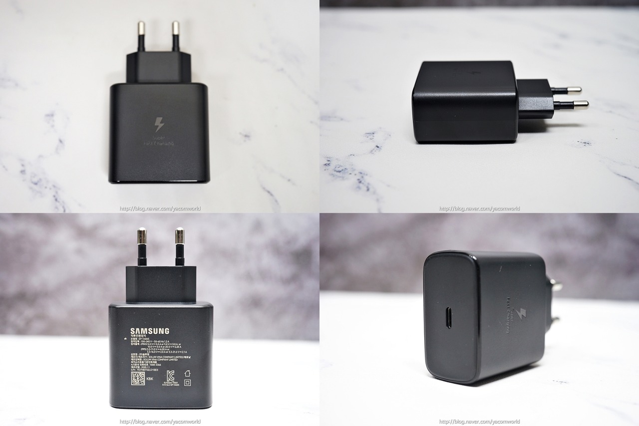 삼성전자 충전기는 아트뮤와 동일하게 PPS를 지원한다. 최대 45W까지 지원하는 1 PD포트 제품이다. 주목할 점은 기본 구성품에 1M 길이의 USB Type-C to C 케이블이 제공된다는 것이다.