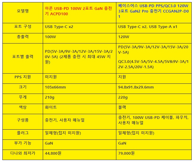 GaN(질화 갈륨) USB PD 충전기 중에서도 100W급 고출력이 가능한 제품이 존재한다. 리뷰어 '나무통123'은 고출력 GaN USB PD 충전기 '아콘 ACPD100'과 '베이스어스 CCGAN2P-D01'을 비교했다. 질화갈륨 특유의 작은 사이즈는 물론 출력까지 뛰어난 것이 특징이다.