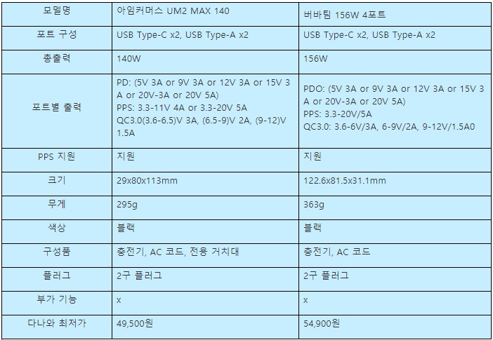 두 제품 모두 USB Type-C 포트 2개, USB Type-A 포트 2개를 갖췄으며, 단일 포트 충전 시 최대 100W 출력이 가능해 고성능 노트북 충전용으로도 적합하다. 참고로 버바팀 제품은 상자에 108W로 표기했으나, 실제 최대 출력은 156W이고 아임커머스 제품은 140W를 지원한다.
