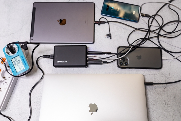 리뷰어는 총출력 상태의 실제 소비전력을 확인하기 위해 출력에 맞게 45W의 삼성 올웨이즈9 노트북, 15W의 LG 지패드5 10.1 LTE 태블릿, 25W의 삼성 갤럭시 노트20 울트라 5G 3대의 기기를 연결했다.