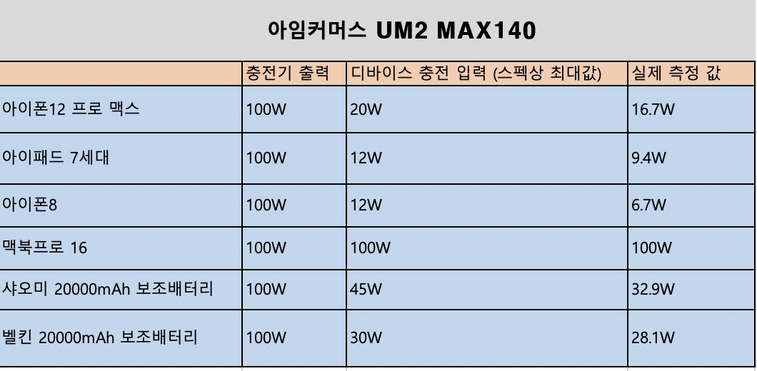 하지만 "아임커머스 UM2 MAX140은 PPS가 36W라 삼성 갤럭시 제품 중 45W 출력을 지원하는 스마트폰을 45W로 충전시킬 수 없었다. 기본 제공 AC 케이블 길이가 조금 짧아 배치하는 위치에 따라 케이블을 따로 구입해야한다는 아쉬움이 있다."는 언급도 찾아볼 수 있었다.