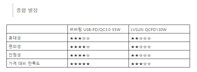 가격 대비 만족도는 버바팀 USB-PD/QC3.0 55W쪽이 우세했다.