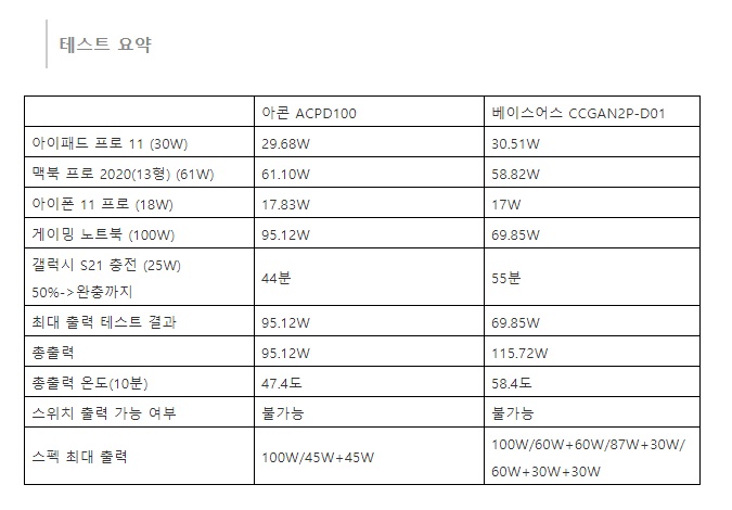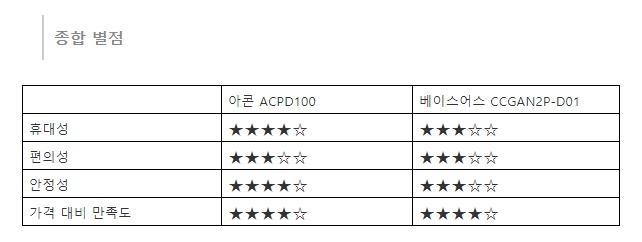 최종 평가는 어떨까? 비교에 사용된 제품은 100W급 노트북을 충전할 수 있을 정도로 강력한 출력을 지녔다. 다만, "포트의 개수가 2~3개라 거치형으로 사용하기에는 조금 아쉬울 수 있을 것 같다."는 평을 발견할 수 있었다.
