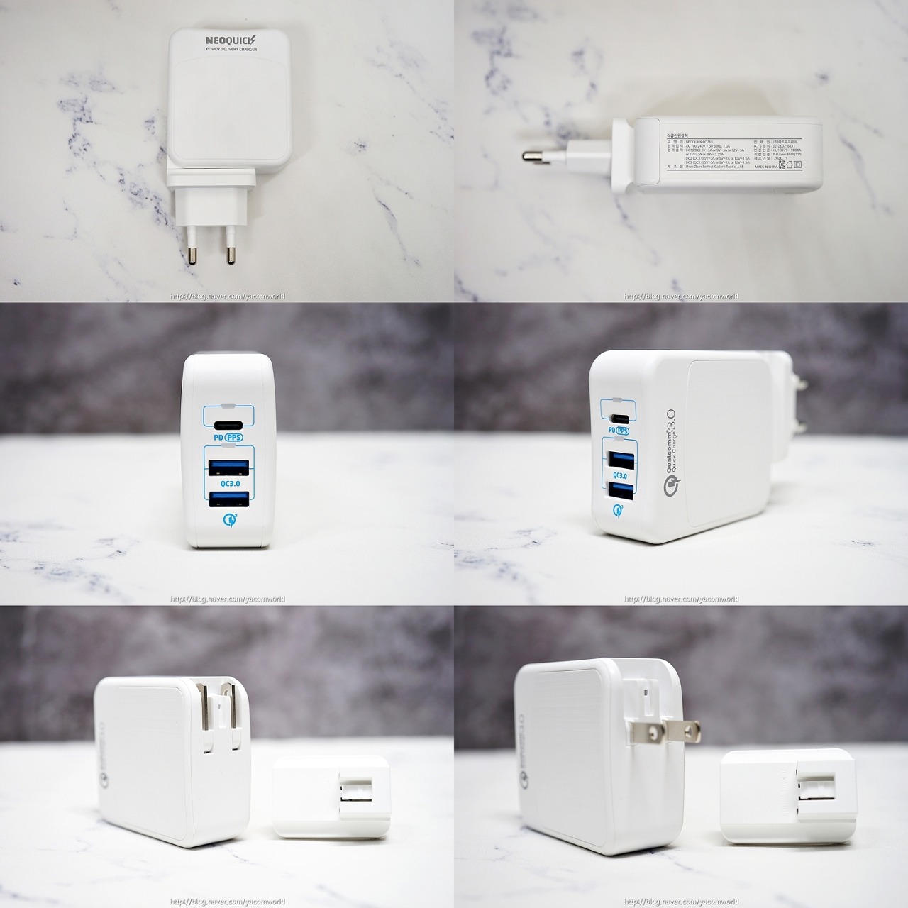 아트뮤 제품은 상단에서 언급한 바와 같이 PD & 퀵차지3.0 멀티 충전기로 1개의 PD포트와 2개의 USB3.0 포트로 구성이 되어있다. 최대 65W까지 지원을 해 웬만한 PD충전 디바이스들을 모두 호환하는 충전기다. 220V 플러그를 분리하면 110V 환경에서도 사용 가능한 것이 특징이다. 접지 플러그가 아닌 일반 플러그가 탑재됐다.
