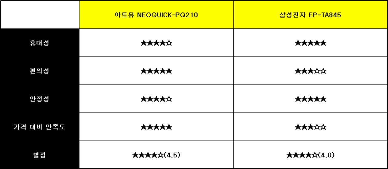 리뷰어는 리뷰를 마치며 "다나와에서 각각 1,2위를 다투는 제품인 만큼 장단점이 분명하게 나뉘는것 같다."고 언급했다. "삼성전자 EP-TA845는 휴대성은 뛰어나지만 여러 제품을 충전할 수 없다"고 지적했으며, "제품의 가격 차이가 많지 않기 때문에 성능이 뛰어난 아트뮤 NEOQUICK-PQ210을 선택할 것."이라고 아트뮤의 손을 들어줬다.