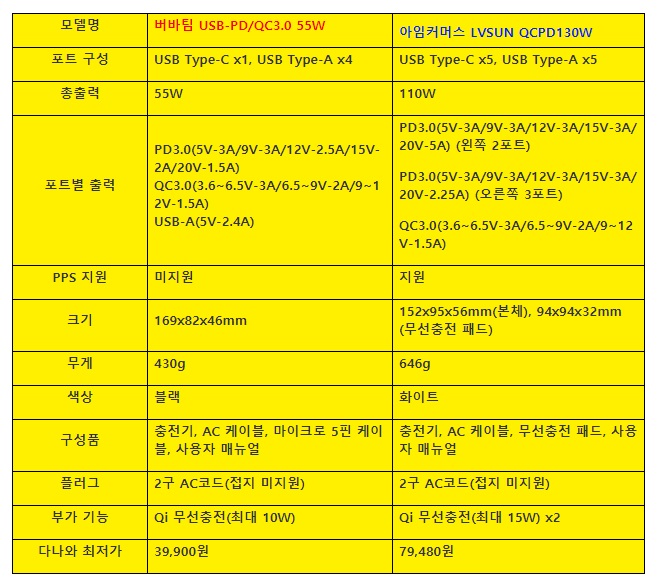 이런 고민에 빠져 있다면, 무선충전이 가능한 USB PD 충전기는 어떨까? 이 리뷰에서 비교한 제품은 '버바팀 USB-PD/QC3.0 55W'와 '아임커머스 LVSUN QCPD130W'다. 총출력이 2배 가량 차이나는 점에서 두 제품이 타게팅하는 소비자가 명백히 다른 것을 알 수 있다.