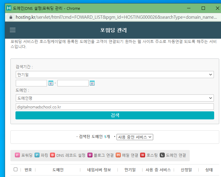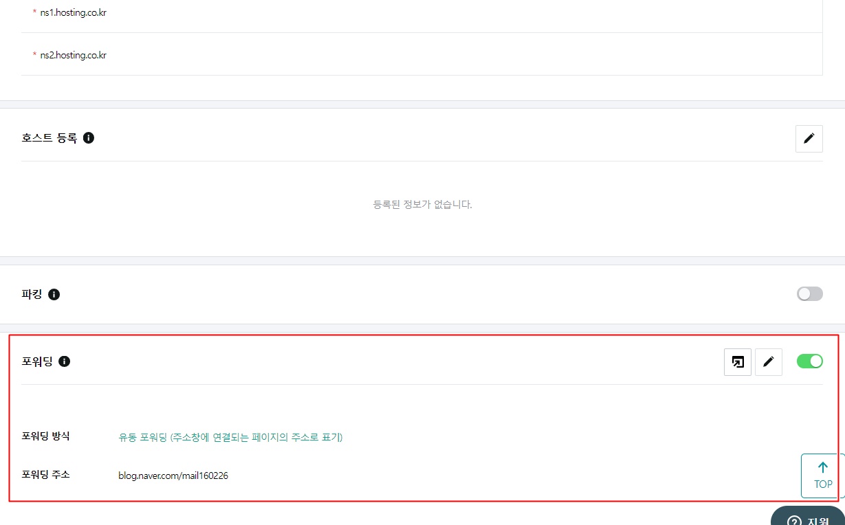 호스팅케이알 http://hosting.kr 인 경우 도메인관리 - 해당 도메인 - 작업 - DNS 레코드 설정으로 가면 포워딩하는 메뉴가 있습니다.