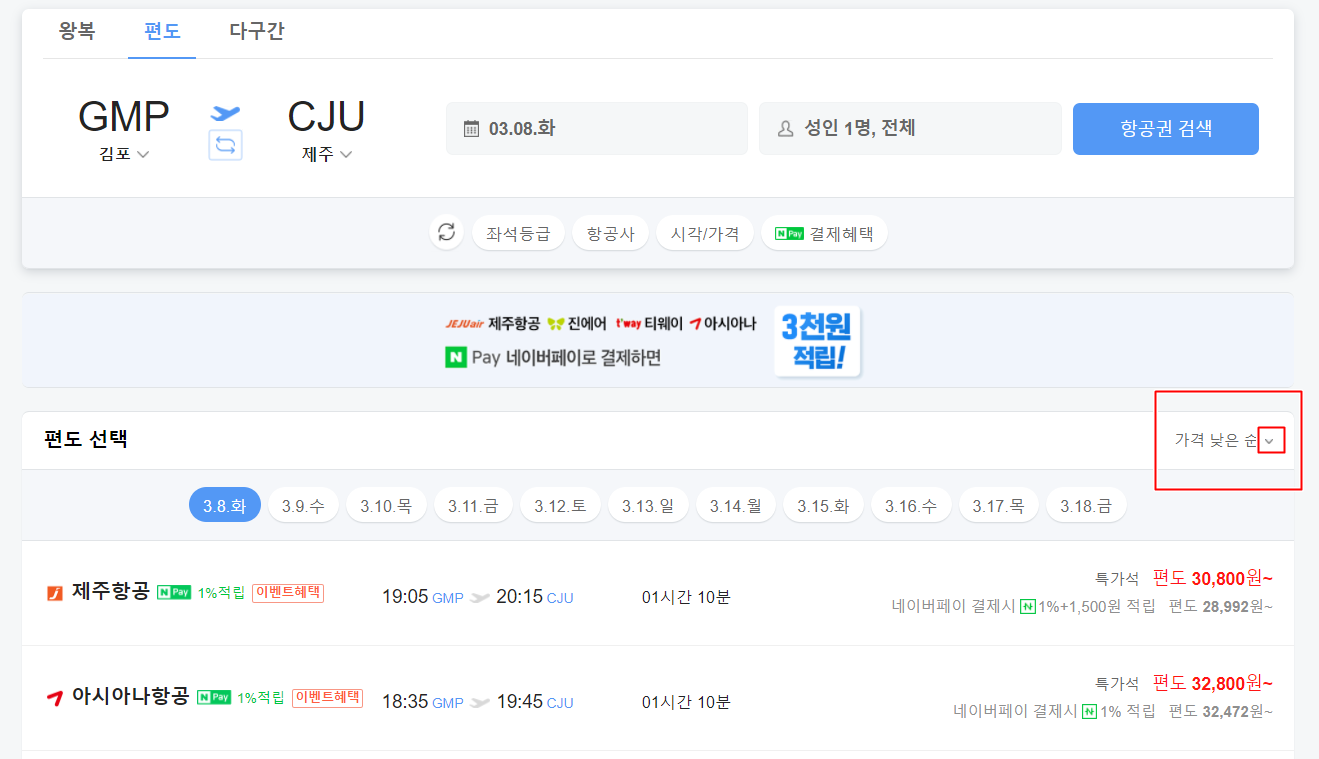 출발시간빠른순 , 가격 낮은 순으로 검색할수 있습니다.