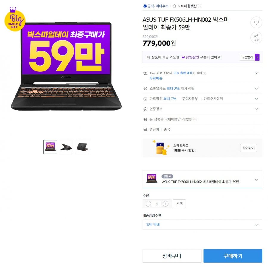 G마켓 에이수스 터프 FX506LH-HN002 게이밍 노트북 (779,000원/무료)/빅스마일데이 최종구매가 59만원때 구매가능