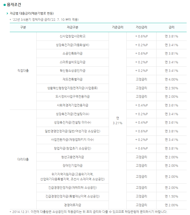 - 2014.12.31. 이전에 대출받은 소상공인의 적용금리는 위 표의 금리와 다를 수 있으므로 해당은행에 문의하시기 바랍니다.