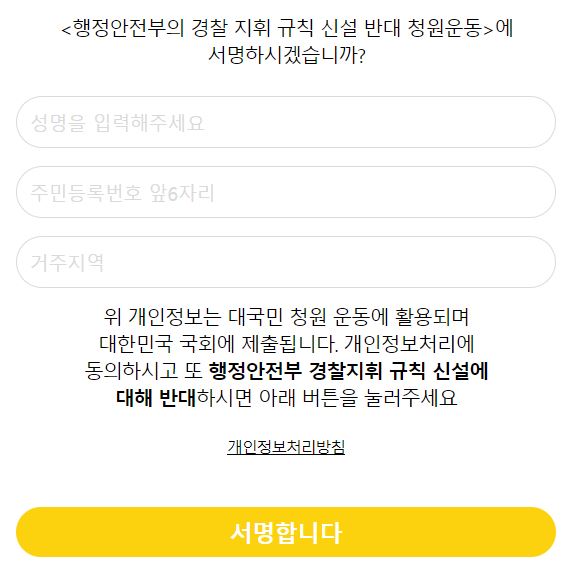 행정안전부의 경찰 지휘 규칙 신설 반대 청원운동에 동의하면 아래 링크된 사이트에서 간단한 개인정보 등록후