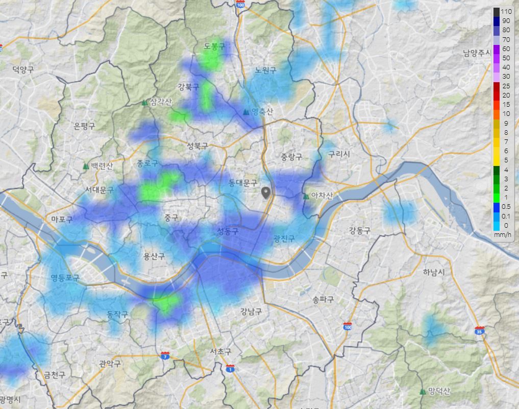 지역마다 편차가 존재하므로 초단기예측으로 확인하는게 좋습니다.