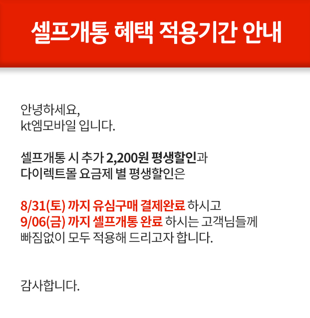 셀프개통 프로모션기간은 지난거같지만 9월6일(금)까지 프로모션 기간이 연장되었다