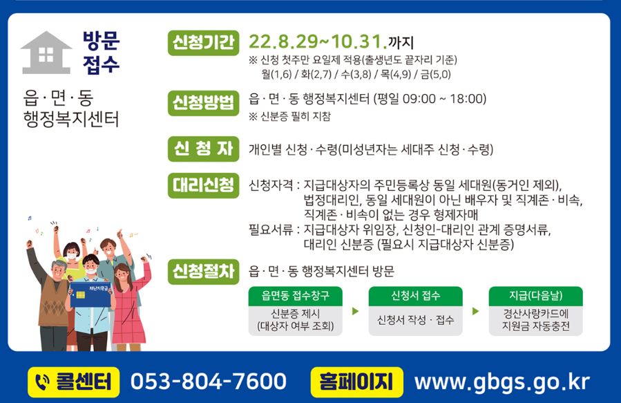 - 읍면동 방문(카드즉시지급) - 주소지 읍․면․동 행정복지센터 방문(신분증, 대리신청시 위임서류 일체)