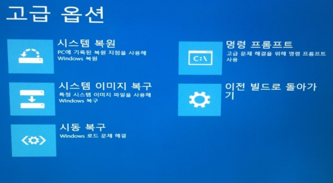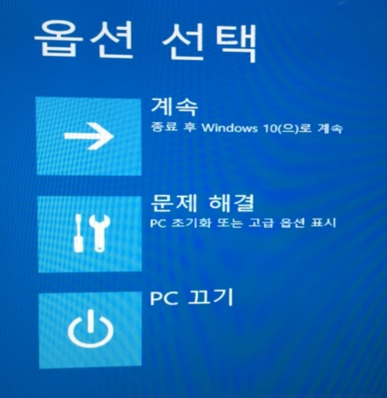 win10 설치용으로 부팅하여 컴퓨터 복구를 클릭하고 옵션선택 화면으로 들어갑니다.