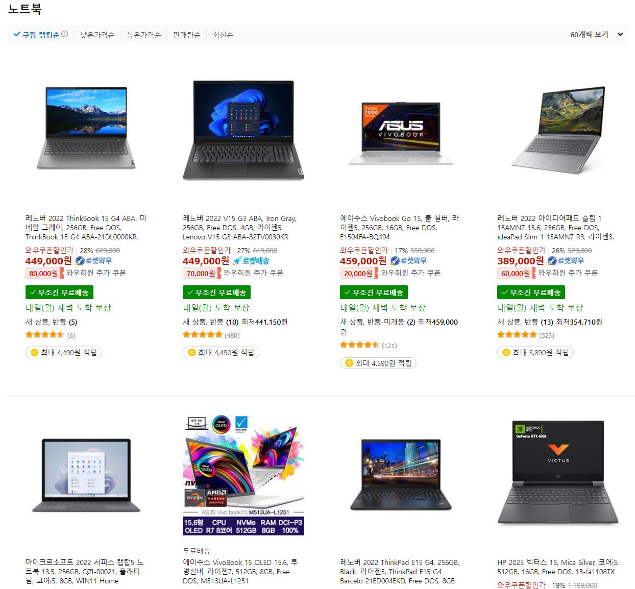 쿠팡에서 파는 노트북은 다나와나 네이버에서 표시되는 노트북보다 가격이 저렴한 경우가 종종 있습니다.