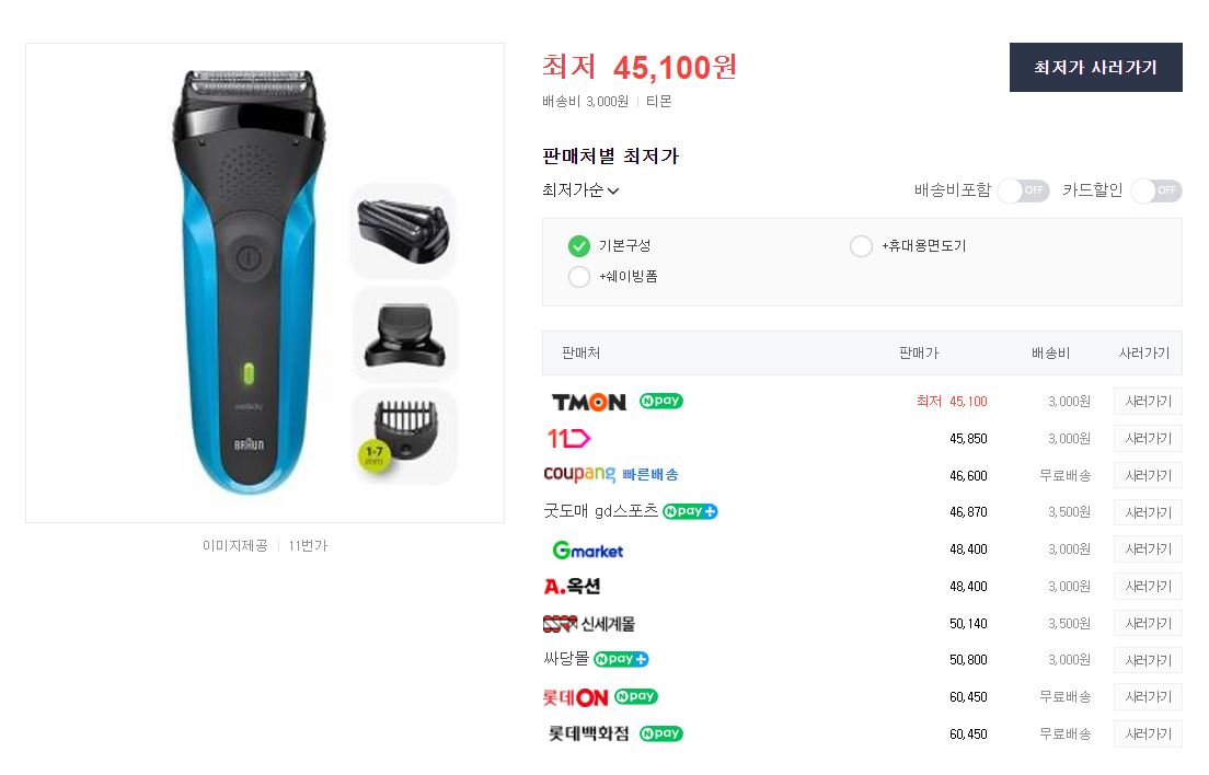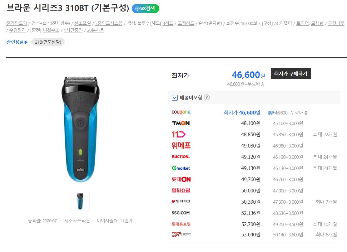 11월 19일날 이 글을 올리고 19일 구입 , 20일 날 브라운 전기면도기 310BT를 받았습니다.