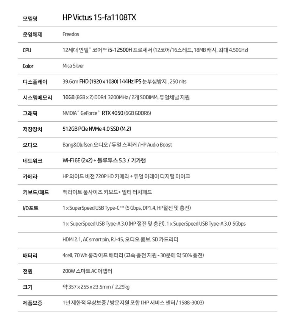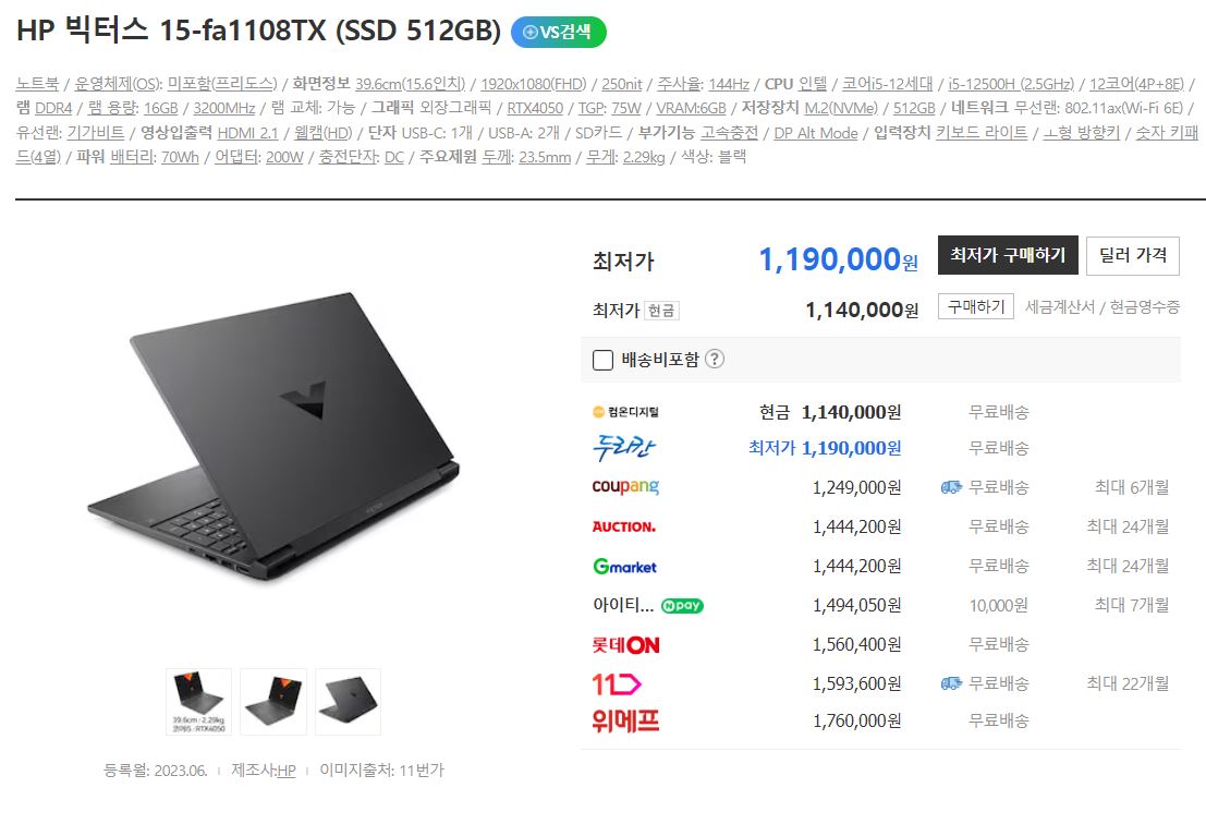 쿠팡 노트북 랭킹 2위 가성비 노트북 HP 2023 빅터스 15 지포스 RTX 4050 15-fa1108TX