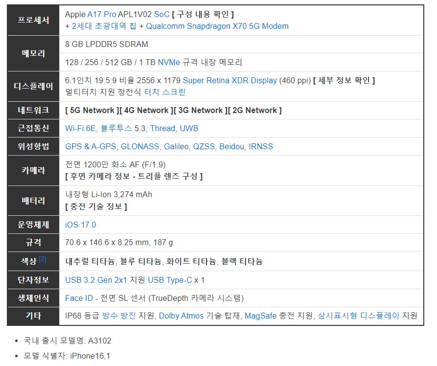 Apple 정품 아이폰 15 Pro 자급제 주요 특징과 세부 사항 가격정보 상품평 보러가기