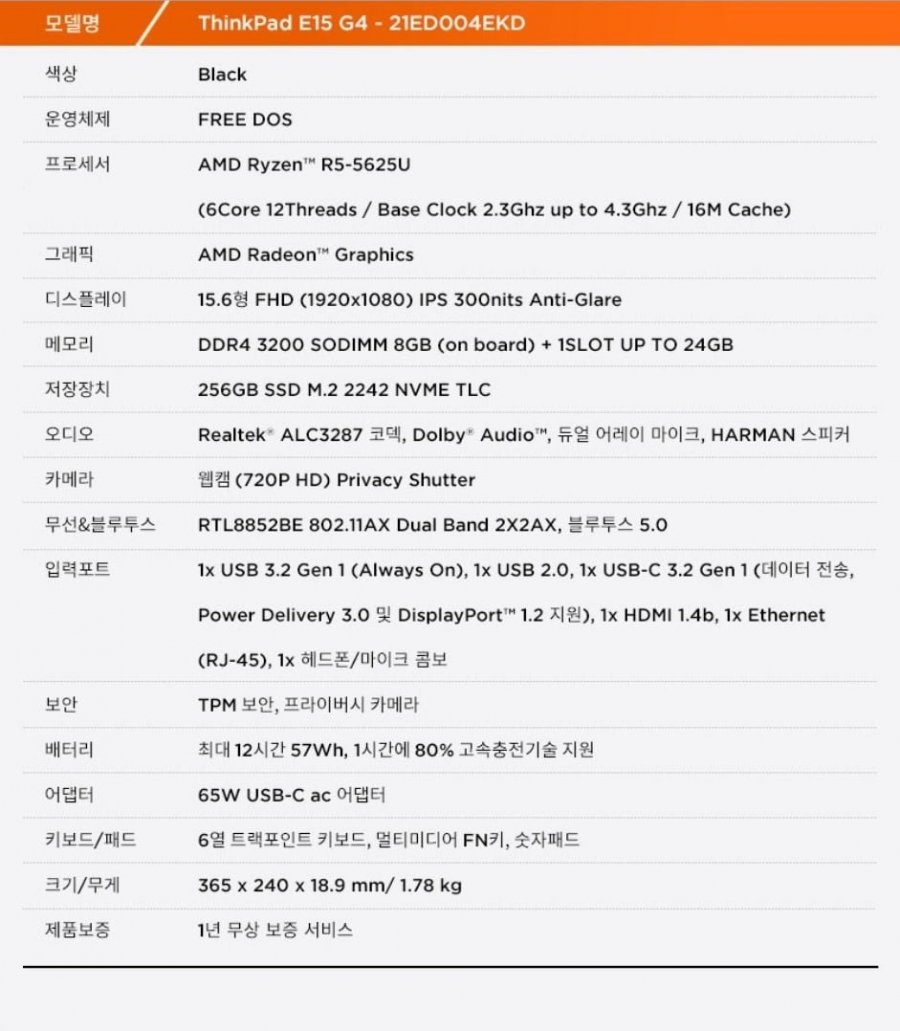 가격과 성능 다 만족스럽다 가성비 노트북 레노버 2022 ThinkPad E15 G4 15.6 씽크패드 E15 G4 - 21ED004EKD