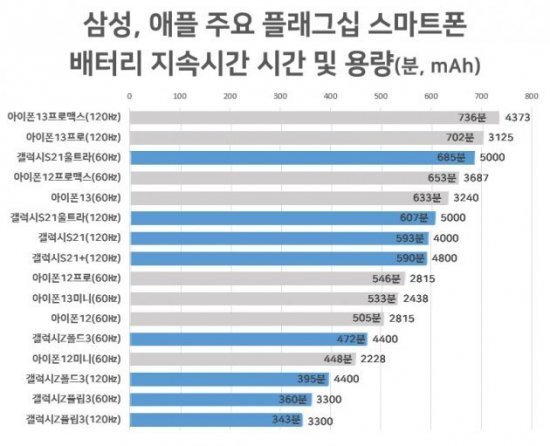 삼성, 애플 주요 플래그십 스마트폰 배터리 지속시간 , 아이폰13미니 경우 533분