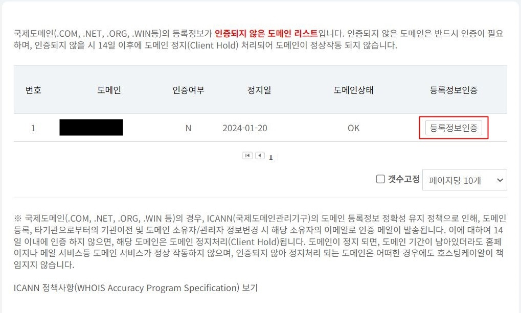 국제도메인(.COM, .NET, .ORG, .WIN등)의 등록정보가 인증되지 않은 도메인 리스트입니다. 인증되지 않은 도메인은 반드시 인증이 필요하며, 인증되지 않을 시 14일 이후에 도메인 정지(Client Hold) 처리되어 도메인이 정상작동 되지 않습니다.