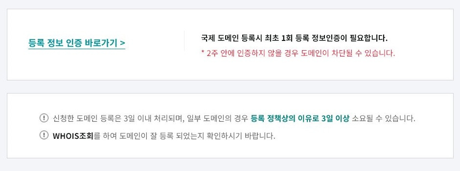 com도메인 구입후 국제 도메인 등록시 최초 1회 등록 정보인증이 필요합니다